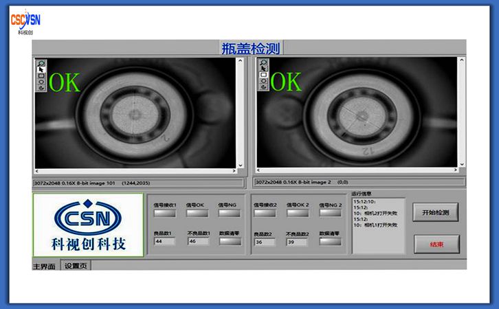 本系統(tǒng)主要用于飲料瓶瓶蓋檢測。采用兩個相機(jī)分別對一 個流道兩排產(chǎn)品進(jìn)行檢測。本檢測采用外觸發(fā)模式,當(dāng)產(chǎn)品流 入相機(jī)下方位時,觸發(fā)光電感應(yīng)器,進(jìn)而觸發(fā)相機(jī)拍照。本產(chǎn)品主要的功能為檢測瓶蓋上是否有橡膠墊片,以及橡膠墊片是 否切好開口。